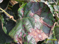 發(fā)病部位多從葉緣開始,初期在葉緣出現(xiàn)水漬狀污綠色小點(diǎn),后期病斑沿著葉緣或向內(nèi)發(fā)展,形成不規(guī)則的病斑,并且病斑逐漸變?yōu)榛野咨“哌吘壋示G色。如果感染果面,則出現(xiàn)淡褐色小點(diǎn),最后呈不規(guī)則褐斑,果皮干腐,果肉腐爛。