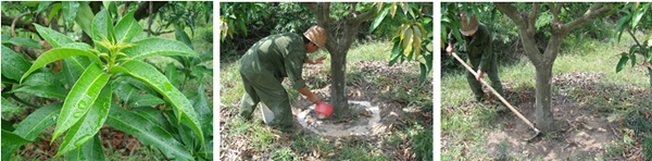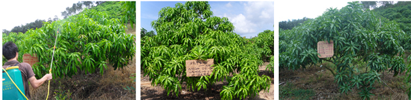 海南三亞福田公司種植戶李伯真18889889828,在2010年6月4日,使用15%國光多效唑可濕性粉劑對金煌芒、澳芒、貴妃芒(樹冠直徑3.5米,樹直徑14cm,土埋60g15%國光多效唑可濕性粉劑;樹冠直徑4.5米,樹直徑14cm,土埋15%國光多效唑可濕性粉劑80g)進(jìn)行土埋處理。后期表現(xiàn)效果:控梢穩(wěn)定,不“沖梢”;葉片濃綠加厚;枝梢生長短壯。圖為福田公司果園。