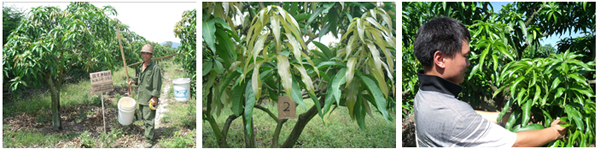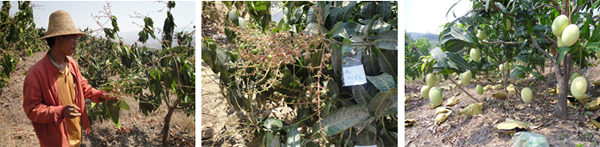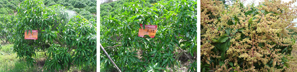 海南三亞英州鎮(zhèn)種植戶蔡桂香,在2010年5月20日,使用國光烯效唑、國光萘乙酸(5%水劑)對臺農(nóng)芒進(jìn)行葉面控梢處理。后期表現(xiàn)效果:不“沖梢”,催花容易,出花整齊。圖為蔡貴香果園。