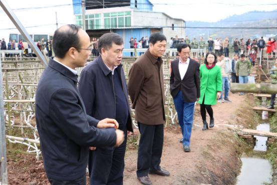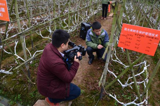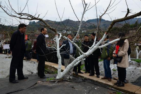 專家領(lǐng)導(dǎo)們?cè)趪?guó)光“冬保護(hù)”桃樹基地觀摩
