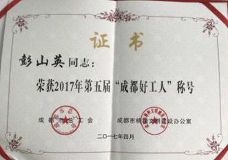 公司研發(fā)部彭山英榮獲2017年第五屆“成都好工人”稱號