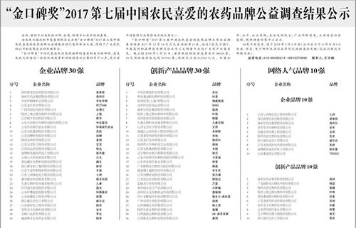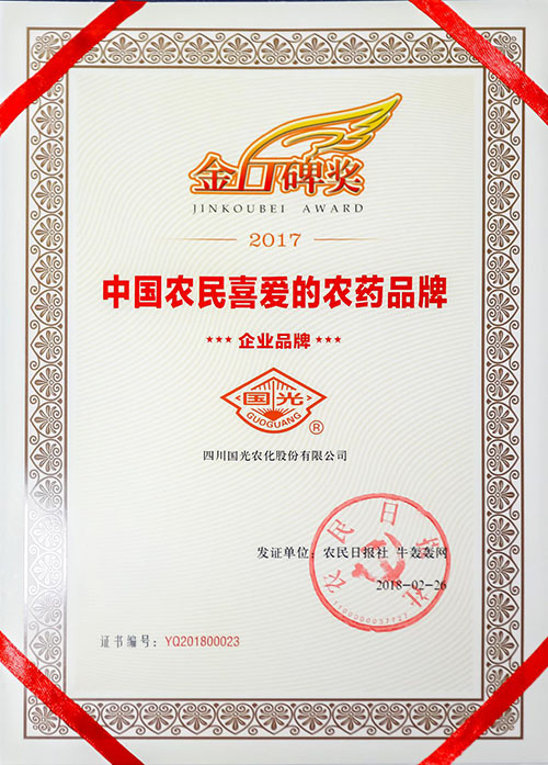 國光榮獲“2017金口碑獎”,該獎代表農(nóng)民對農(nóng)藥品牌的喜愛和真實的評價,是目前中國農(nóng)藥行業(yè)有影響力的大獎之一。