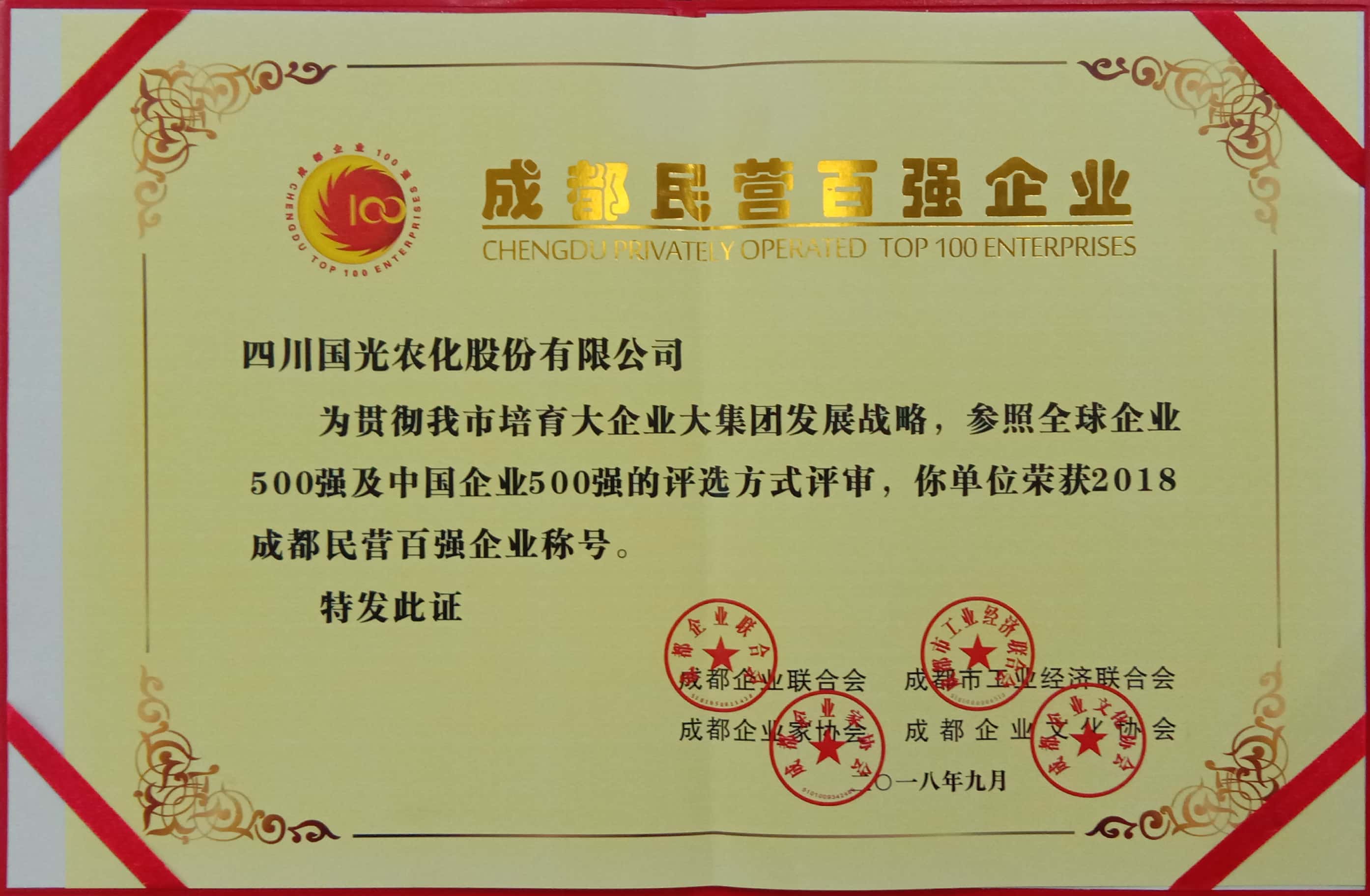 公司榮獲“2018成都企業(yè)100強(qiáng)”稱(chēng)號(hào)