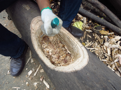 1、在樹干上用銼刀挖出一個(gè)樹洞,將樹洞邊緣及底部修整平(圖1);