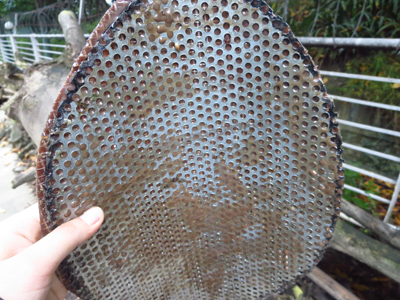 4、用剪刀剪下一塊與樹洞洞口大小一致的鐵皮(圖4)及制作好的仿真樹皮,將國光仿真樹皮專用膠及顏料調(diào)勻,涂抹在仿真樹皮背面后,將仿真樹皮粘貼在剪好的鐵皮上(圖5);