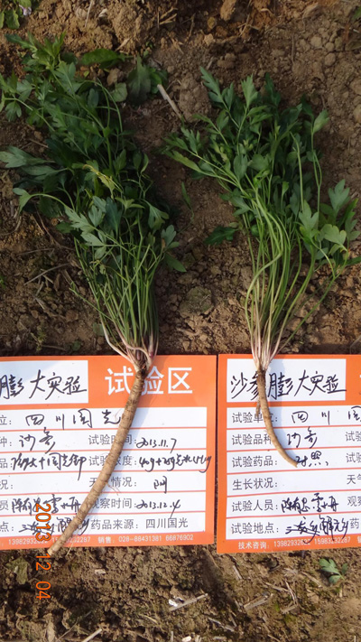 南沙參在12月開始地上部生長基本穩(wěn)定,地下根莖干物質(zhì)開始積累,根莖迅速膨大,此時(shí)正是根莖迅速膨大和積累干物質(zhì)的關(guān)鍵時(shí)期。通過有效的化學(xué)調(diào)控可以顯著的提高南沙參的產(chǎn)量和干物質(zhì)的積累。2013年12月閬中市解元鄉(xiāng)南沙參種植戶何維超使用以下化學(xué)調(diào)控技術(shù),其南沙參增產(chǎn)率達(dá)到20%以上。具體使用方法如下: