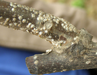 屬于同翅目,體外有蠟質(zhì)介殼。卵通常埋在蠟絲塊中、雌體下或雌蟲分泌的介殼下。 介殼蟲繁殖能力強(qiáng),一年發(fā)生多代。卵孵化為若蟲,經(jīng)過短時(shí)間爬行,營(yíng)固定生活,即形成介殼。介殼蟲抗藥能力強(qiáng),一般藥劑難以進(jìn)入體內(nèi),防治比較困難。