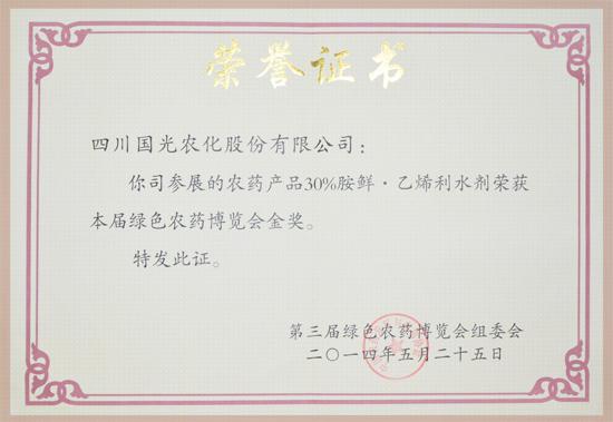 2014年5月25日,由中國農(nóng)藥發(fā)展與應(yīng)用協(xié)會主辦的第三屆綠色農(nóng)藥博覽會在山東濰坊舉辦。依據(jù)《中國綠色農(nóng)藥博覽會參展農(nóng)藥評選辦法》,經(jīng)過第三屆綠色農(nóng)藥博覽會組委會認真評選,“國光30%胺鮮·乙烯利水劑”榮獲第三屆綠色農(nóng)藥博覽會金獎。這也是繼“國光0.1%三十烷醇微乳劑”獲得第一屆綠色農(nóng)藥博覽會金獎后再次榮獲金獎。