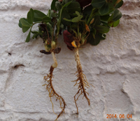 癥狀:花生根結(jié)線蟲病主要為害植株的地下部,因地下部受害引起地上部生長發(fā)育不良。幼苗被害,一般出土半個月后即可表現(xiàn)癥狀,植株萎縮不長,下部葉變黃,始花期后,整株莖葉逐漸變黃,葉片小,底葉葉緣焦灼,提早脫落,開花遲,病株矮小,似缺肥水狀,田間常成片成窩發(fā)生。雨水多時(shí),病情可減輕。